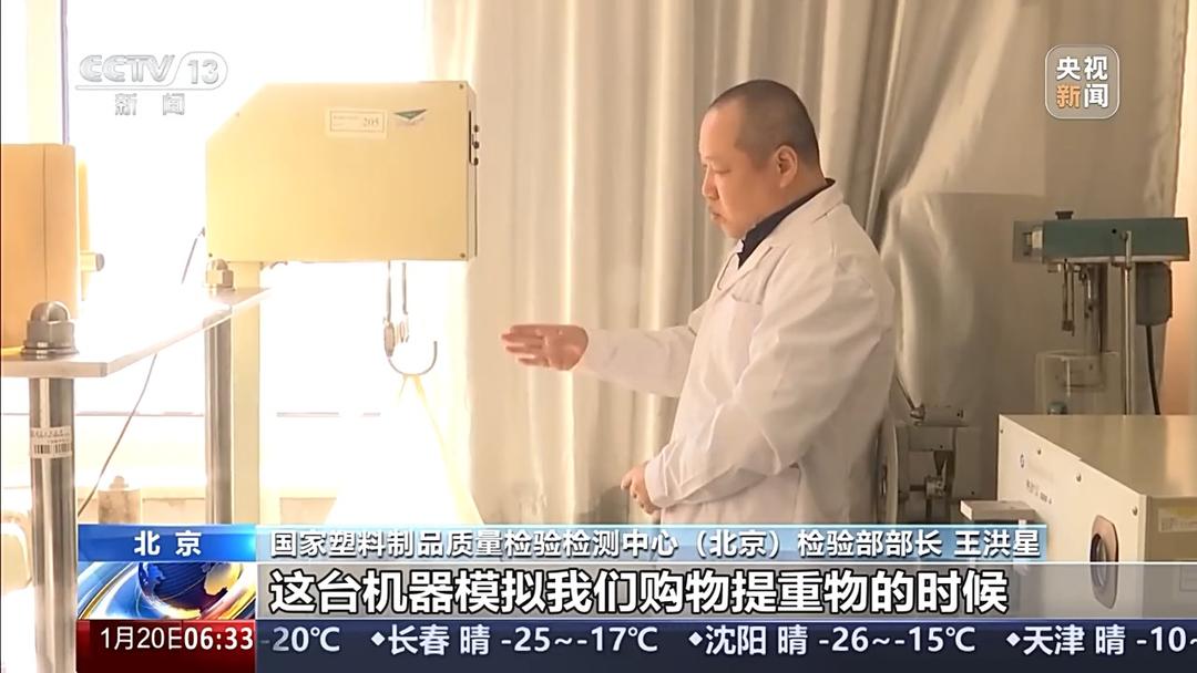 國家塑料制品質(zhì)量檢驗(yàn)檢測(cè)中心(北京)檢驗(yàn)部部長 王洪星:這臺(tái)機(jī)器模擬我們購物提重物走路的時(shí)候,可能會(huì)有自然的抖動(dòng)。提吊是按照固定頻率1800次。如果不出現(xiàn)問題,就算合格。