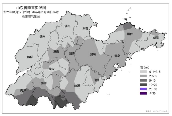 從過程降雪量來看,17日20時至20日6時,全省普遍出現(xiàn)降雪,平均降雪量2.9(毫米,下同)。各市平均:棗莊9.9、菏澤4.4、濟寧3.9、臨沂3.4、淄博3.3、濰坊3.1、青島3.1、煙臺2.9、日照2.3、東營2.1、泰安2.0、濟南2.0、濱州1.9、威海1.8、德州0.8和聊城0.5。降雪量前3位的是:棗莊薛城13.5、棗莊嶧城12.7和棗莊臺兒莊11.5。